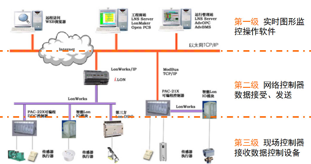 該系統(tǒng)是智能弱電系統(tǒng)的核心,監(jiān)控照明控制系統(tǒng)、給排水控制系統(tǒng)、暖通空調(diào)系統(tǒng)、變配電控制系統(tǒng),采取三級控制方式。
